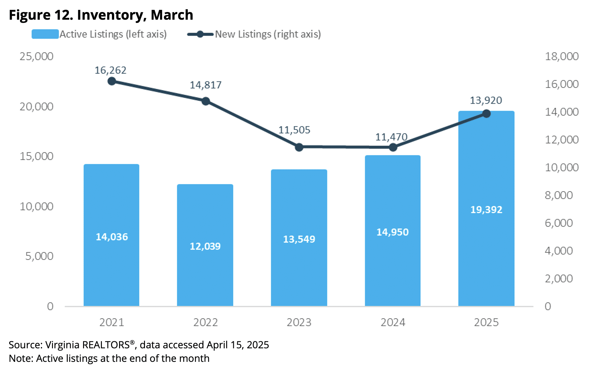 - There were 19,392 active listings on the market throughout Virginia at the end of March. This is a 29.7% increase over last year’s levels, about 4,400 more listings.
