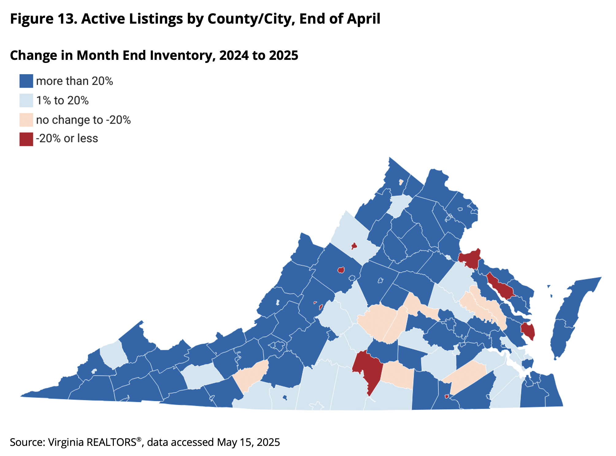 - At the end of April, there were 21,739 active listings on the market across Virginia, 5,692 more listings than last year, representing a significant 35.5% jump in inventory levels.