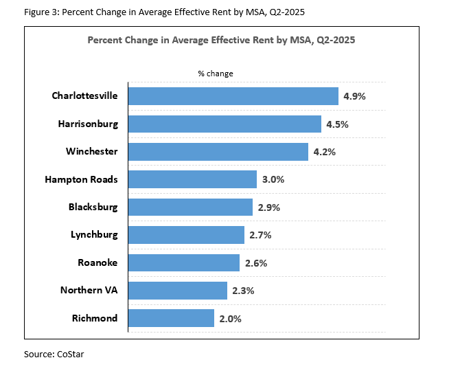 The average effective rent per unit in Virginia was $1,826 in Q2 2025, increasing 2.5% from the same time last year, signifying that rental prices continue to rise. Rental prices went up in all nine metro areas of the commonwealth. Charlottesville topped this list by representing a 4.9% increase in rent while Richmond had the slowest increase in rent of 2.0%.