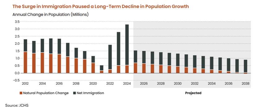 Immigration has become the primary driver of population growth over the past few years. Between 2022 and 2024 there was an average of 2.3 million immigrants a year, up from 830,000 the decade before. This population was responsible for 55% of the annual household growth in 2023, adding nearly 800,000 households. Immigration has staved off population declines with the natural population change (births minus deaths) falling from 1.2 million on average to 412,000 in the last two years. The U.S. Census Bureau projects that 8.6 million new households will form between 2025 and 2035 if net foreign migration stays at an annual rate of 900,000.