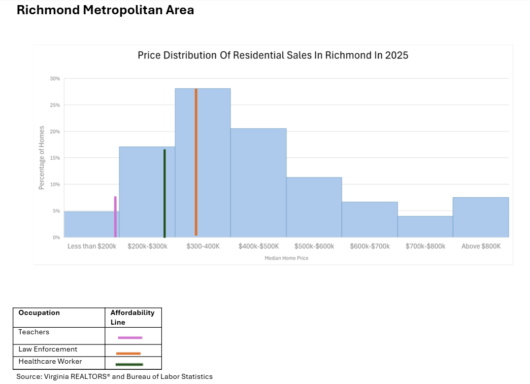 While many households rely on dual incomes to purchase a home, this analysis focuses on individual wages to illustrate how affordable the market is for each occupation. The goal is to provide a clear snapshot of general housing affordability conditions faced by essential workers across Virginia.