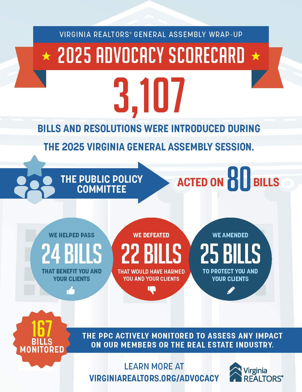The 2025 Virginia General Assembly Session was full of activity, and VAR’s Government Relations Team was at the Capitol every step of the way—standing up for REALTORS®, home buyers and sellers, and the broader real estate community. This year’s Scorecard highlights the key legislation we tracked, supported, or opposed—and the final outcomes that affect your business.